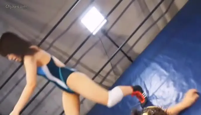Watch a wrestling match between a masked male and a female in a blue and white swimsuit, intense action captured in various camera angles