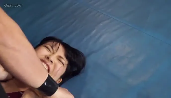 Watch intense wrestling match between Asian female and Caucasian male in a blue mat wrestling ring, featuring close-up shots and intense moments.