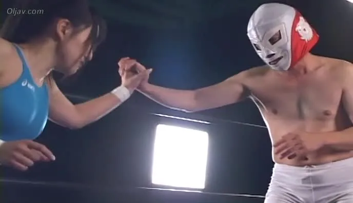 Watch the intense wrestling match between a dark-haired woman and a masked male opponent, featuring pinning and dramatic moments