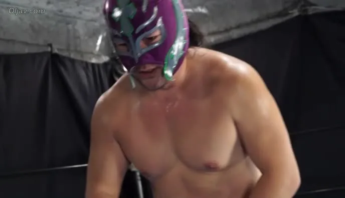 Watch as a dark-haired woman in a red singlet struggles against a masked opponent in a intense wrestling match