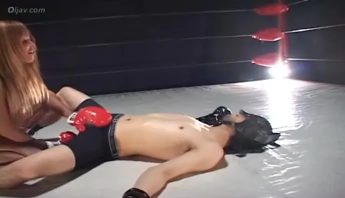 Experience the intensity of a wrestling ring encounter between a muscular Asian man and a slim Asian woman in red
