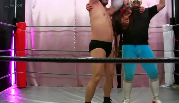 Watch intense female wrestling as two dark-haired women clash in a ring, surrounded by pink curtains and gray mats.