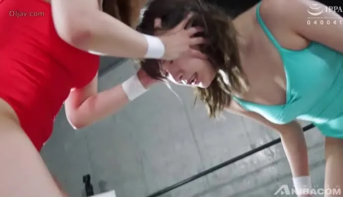Watch two dark-haired women engage in an intense wrestling match, wearing red and teal swimsuits, on a wrestling mat.